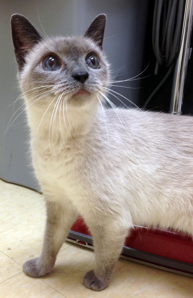 "Sheba is a sweet and petite darling of a cat! About 11 years old, she prefers the quiet life and genuinely adores attention and being near her special person. Her foster mom says she's a doll baby and would make an excellent companion. She's more fond of a affection than her toys, but a good pinch of catnip now and again makes her quite happy! Sheba's pretty blue eyes have a unique marble pattern to them, and her coat is a stunning lilac point color.